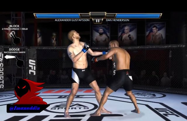 Next we will fight again the third fighter which we will face the third fighter which we also wear fighter named ALEXANDER GUSTAFSSON which work as a BOXING fighter with power level and 153 against the Boxer named DAN HENDERSON and which profession as a STRIKER with the fighter-level power 158 that where we lose the next level against these fighters will appear a button that says CONTINUE to start the fight and by pressing a button named CONTINUE to start this fight. later in the third fight we will teach how to survive from the opponent which will appear the words called BLOCK and DODGE which first uses BLOCK to withstand the blows of the opponent by way of holding it with both a resistant where so we can do this BLOCK we should use two fingers and pressing on the screen of our mobile phones so you can deflect the opponent's punches with both hands and the second uses DODGE to withstand the blows of the opponent by way of backing into the back so that the opponent cannot wear his blows toward us and how to do it in a way we should use one finger and his moves towards the left so that the Boxer we will retreat to the back so we won't be exposed to blows the next opponent in this fight there is strength and that we can use this power will emerge if we managed to hit the opponent continuously and this power will give a red sign on the screen of this game called ABILITY and where later will appear 3 power which we can use to beat your opponent which if the opponent is hit at our strength once it will be blood opponents will be reduced quickly so that if exposed to 3 power blow we could defeat opponents will be fast.