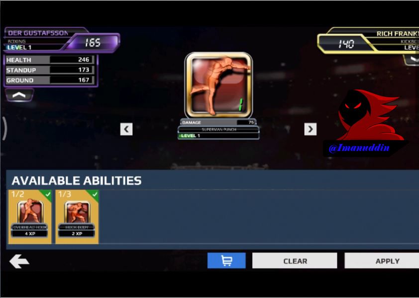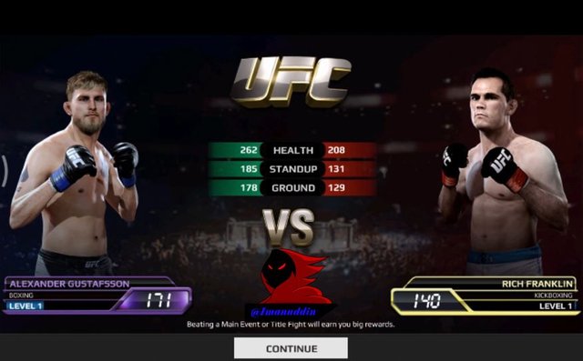 Next we run the second bout here as usual I wear Boxer named ALEXANDER GUSTAFSSON which profession as the Boxer BOXING against a fighter named RICH FRANKLIN that which the profession as a boxer KICKBOXING with a further 140 power level will appear a button that says CONTINUE to start the fight, and by pressing a button named CONTINUE to start this fight. before going into the match we will go into the menu who pays to upgrade the level of our power level so that if we grow stronger then our power also increased strongly in the power of which will appear power named SUPERMAN PUNCH and there are other strengths as well and how to upgrade This power is very easy then we can press a key strength that we want then we need to find the menu that says APPLY so if it mnekan the APPLY button then the power we will increase so that if exposed to the opponent so the opponent's blood will quickly diminish. Next we will look at the changes in the level of the power of our fighters which increased to 171. After successfully signing in to fight then we must be good at regulating strategies must be good at hitting and also see blood with how to view our blood will be on the blue line marked above the screen of this game which is our blood not to diminish so that we will lose or KO so we must be good at hitting the opponent with the way teach like a LIGHT TAP, SWIPE, MEDIUM HEAVY DIAGONAL SWIPE. the first which I will explain the function of the LIGHT TAP of which point to hit the opponent by pressing the button on the mobile phone you guys all. the second function of the MEDIUM SWIPE which is useful for hitting with the use of the fingers by means of sliding the fingers to the right so that the opponent could hit properly. the third function of the HEAVY SWIPE DIAGONALLY which is also useful for hitting an opponent from the bottom over which shifts the way our fingers on the screen of mobile phone from the ground up to be able to use this punch properly. next in this fight there is strength and that we can use this power will emerge if we managed to hit the opponent continuously and this power will give a red sign on the screen of this game called ABILITY and which later will appear 3 power which we can use to beat your opponent which if the opponent is hit at our strength once it will be blood opponents will be reduced quickly so that if exposed to 3 power blow we could defeat opponents will be fast. and we must also be good at dodging blows the opponent in a way that named BLOCK and DODGE which first uses BLOCK to withstand the blows of the opponent by way of holding it with both hold that where so we can do this we should use BLOCK two of our fingers and pressing on the screen of our mobile phones so it can withstand the blows of the opponent with both hands and the second uses DODGE to withstand the blows of the opponent by way of backing into the back so that the opponent cannot wear his blows toward us and how to do it in a way we should use one finger and his moves towards the left so that the Boxer we will retreat to the back so we won't be exposed to blows the opponent so that the opponent is easily our best and get the KO because opponent helpless we make. After successfully winning the bout 2 and will get a star and can continue the fight next that was in the OCTAGON. and here I just hand out 2 fight the next fight because at the same time also how by how bout 1 and 2 that I have completed.