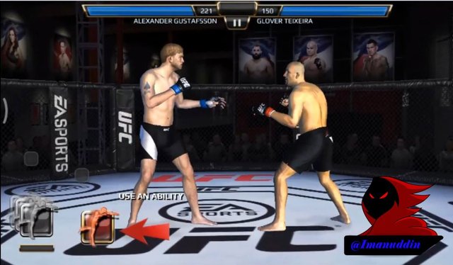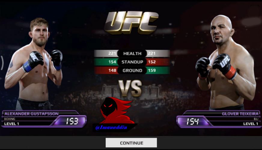 After we managed to fight off the Warriors first then we will face a second fighter which we also wear fighter named ALEXANDER GUSTAFSSON which work as a BOXING fighter with power level and 153 against fighters that named GOLVER TEIXEIRA which profession as the Boxer BJJ which have different levels of strength of 154 1 strength with our fighter. the next button will appear that says CONTINUE to start the fight, and by pressing a button named CONTINUE to start this fight. in this fight we must be good at seeing our blood that will be marked blue line above the screen of this game which do not let our blood is reduced so that we will lose or KO so we must be good at hitting the opponent in a way that is already in teach like a LIGHT TAP, SWIPE, MEDIUM HEAVY DIAGONAL SWIPE. the first which I will explain the function of the LIGHT TAP of which point to hit the opponent by pressing the button on the mobile phone you guys all. the second function of the MEDIUM SWIPE which is useful for hitting with the use of the fingers by means of sliding the fingers to the right so that the opponent could hit properly. the third function of the HEAVY SWIPE DIAGONALLY which is also useful for hitting an opponent from the bottom over which shifts the way our fingers on the screen of mobile phone from the ground up to be able to use this punch properly. next in this fight there is strength and that we can use this power will emerge if we managed to hit the opponent continuously and this power will give a red sign on the screen of this game called ABILITY and which later will appear 3 power which we can use to beat your opponent which if the opponent is hit at our strength once it will be blood opponents will be reduced quickly so that if exposed to 3 power blow we could defeat opponents will be fast.