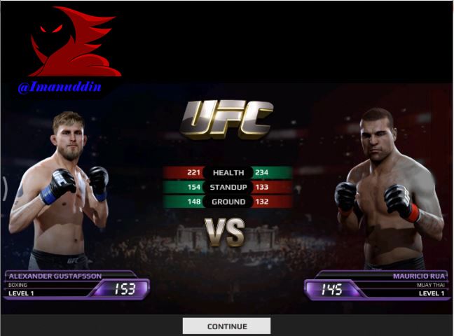 the next menu will appear which can be said as a tutorial of this game which in this tutorial we will wear a boxer named ALEXANDER GUSTAFSSON which work as a BOXING fighter with power level and 153 against fighters that named MAURICIO RUA which profession as a MUAY THAI fighter with power of 145 level. the next button will appear that says CONTINUE to start fighting this tutorial by pressing buttons named CONTINUE. After that the icon will appear on the screen of this game which will be inscribed with the TAP LIGHT, MEDIUM, HEAVY SWIPE SWIPE DIAGONALLY. the first which I will explain the function of the LIGHT TAP of which point to hit the opponent by pressing the button on the mobile phone you guys all. the second function of the MEDIUM SWIPE which is useful for hitting with the use of the fingers by means of sliding the fingers to the right so that the opponent could hit properly. the third function of the HEAVY SWIPE DIAGONALLY which is also useful for hitting an opponent from the bottom over which shifts the way our fingers on the screen of mobile phone from the ground up to be able to use this punch properly. If we're already doing and run 3 punch that we should run properly then we can defeat any opponent and we can complete this tutorial correctly.