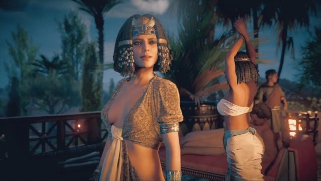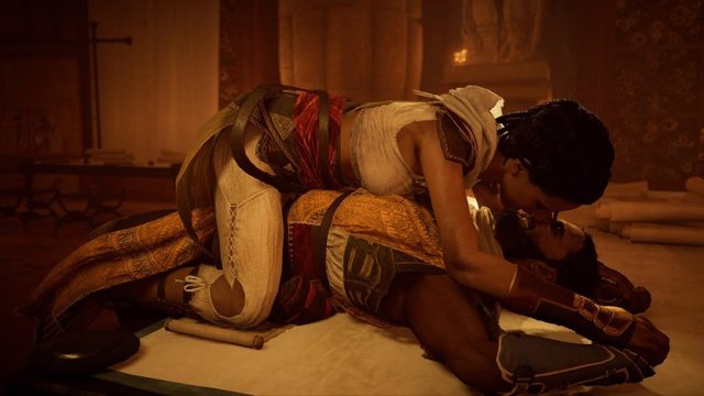 When meeting the queen, Apollodorus advises you to bend a knee in deference and speak only in reply, speak clearly and do not meet her gaze. You’ve heard tales of Cleopatra but when you see her you are struck by her elegance, overt beauty and delicate charm. Her entourage seem of little import. They are drunk, loud and obnoxious. But Cleopatra is something altogether different. She catches you off guard when she propositions you sexually. Embarrassed you fumble for words before apologizing. You tell her you have already pledged your life to someone else. As Aya walks over to you, Cleopatra smiles coyly and tells her she approves of her choice. With the pleasantries over Apollodorus directs you to the queen’s private chambers.