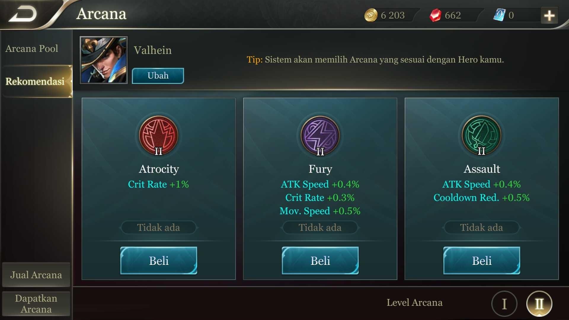 Dalam penggunaan arcana yang cocok, saya harap anda fokus dulu pada pengunaan hero atau membuka level, karena sistem yang akan memilih arcana yang cocok untuk hero anda. Jadi ikuti saja sesuai rekomendasi dari jenis arcana yang terdapat dalam game.