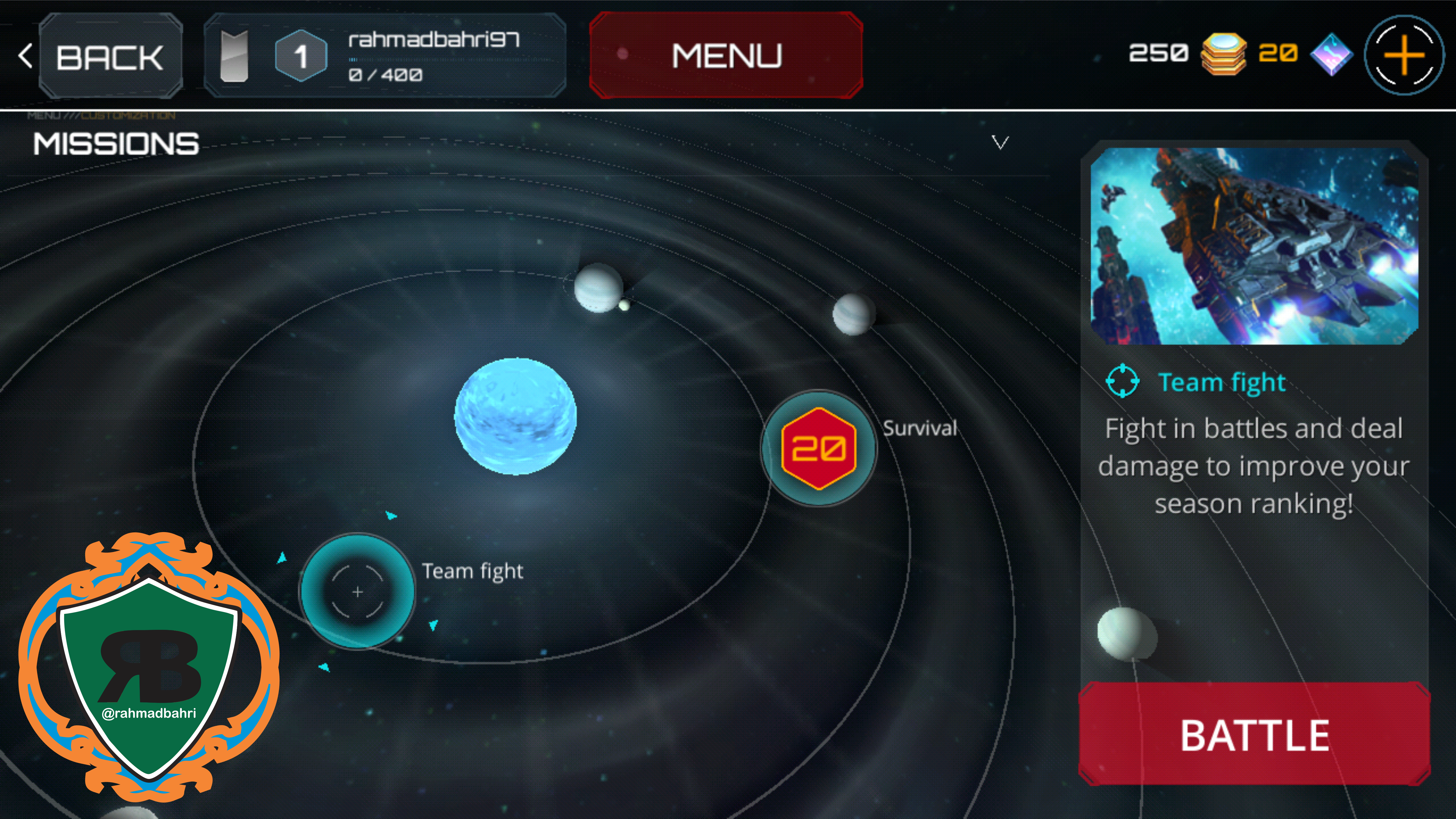 Setelah kita berhasil menekan menu map pada halman utama , kita langsung di hadpin dengan gambar luar angkasa yang merupakan area pertempuran kita. Pada awal bermain kita masih di harus kan bermain perperangan sama tim , lalu kita tekan menu TEAM FIGHT dan kita mendapatkan menu yang mengatakan “fight in battles and deal! Demage to improve your season rangking” dan lalu kita menekan tombol “BATTLE” untuk memulai pertandingan.