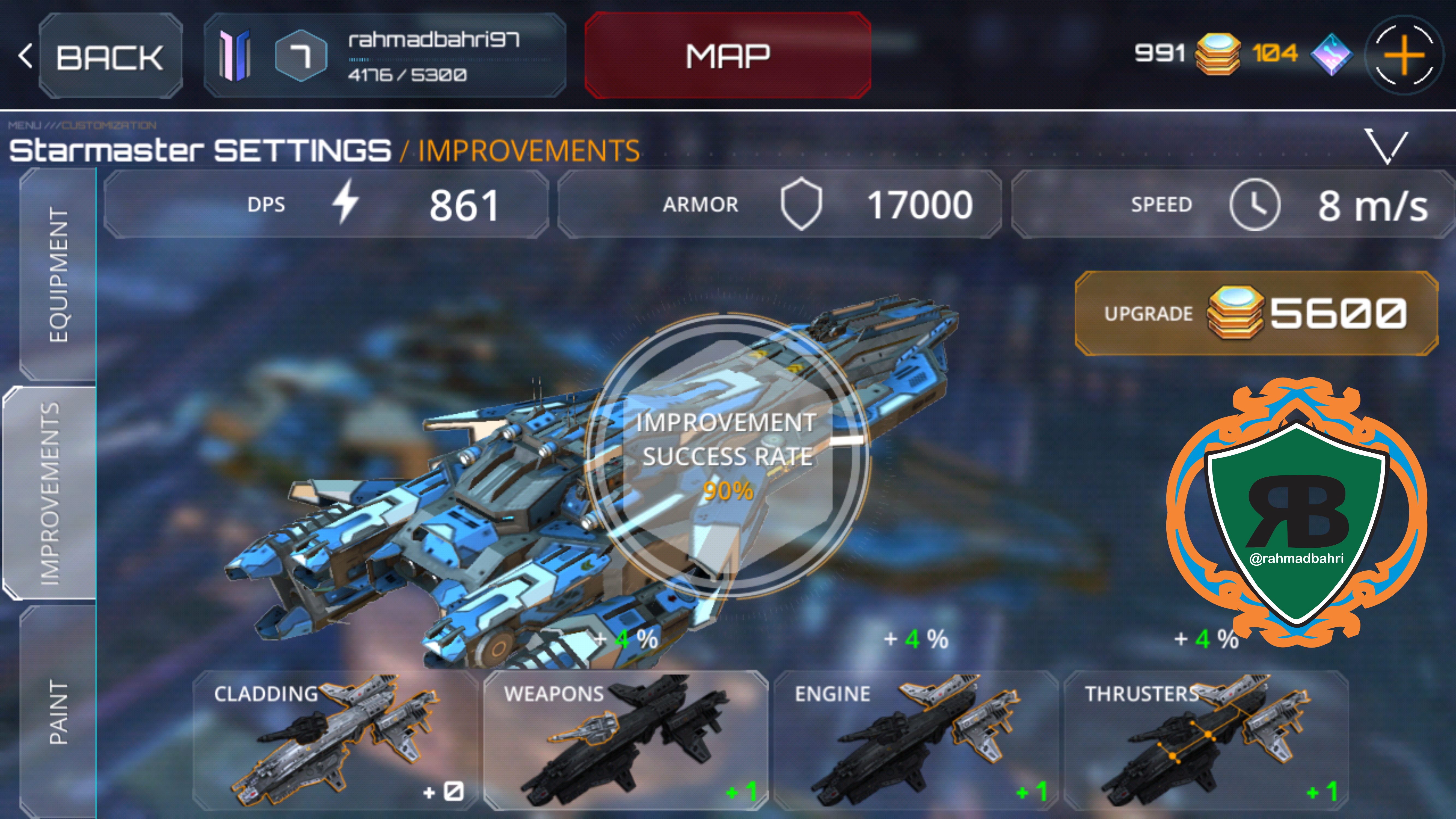 Sebelum masuk kepertandingan , kita harus menambahkan kekuatan kapal perang kita agar dapat merusak semua kapal perang yang akan kita hadpin , di sisni saya menambah kekuatan pada dinding kapal saya dengan pertahan kapal sebanayk 18700 HP dan kekuatan tembakan sebesar 1048 DPS dengan juga kecepatan kapal yang sangat kita perhatikan , saya menbah keceptan kapal dengan mesin ganda sebesar 8 M/s dengan ini kita sangat leluasa menembak dan menghancurkan seluruh musuh yang kita hadpin di area pertempuran .