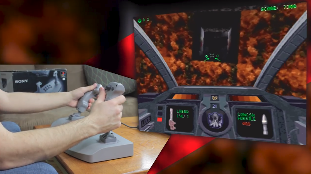 Up first Descent. This is one heck of a game. The original came out on PC at a time when 3D gaming was still in its infancy. The game is pretty much a first-person shooter with a twist — you have free 360 degree movement. The gameplay revolved around you rescuing people, fighting off enemies and destroying a reactor and escaping the exploding level as fast as you can. It's a classic game and still holds up really well. In fact this game is one of the first 3D games I had ever played. The PlayStation version has a few additional elements that surpass its original PC version including a remixed soundtrack, some additional levels, pre-rendered cinematics and even colored lighting effects but what makes this version best in my opinion is the use of this controller. It adds a whole layer of interaction to the game that makes it far more fun to play with than just a regular PlayStation gamepad or even the keyboard. When they started making first-person shooters on computers one of the things that they really didn't include was a strafe option. Very few games from the early ‘90s included the ability to just move directly left or to move directly right. This is something that has become standard in many first-person shooters nowadays but back then that wasn't a thing. So Descent, a game that really should utilize it, turns you left and turns you right with this controller setup. And you kind of need to strafe in this game. Other than that Descent makes perfect use of this controller. Everything interacts so well and in fact I would go so far as to say that if you're going to play this game for the first time you should probably seek out this version of the game with this controller. You will not regret it.