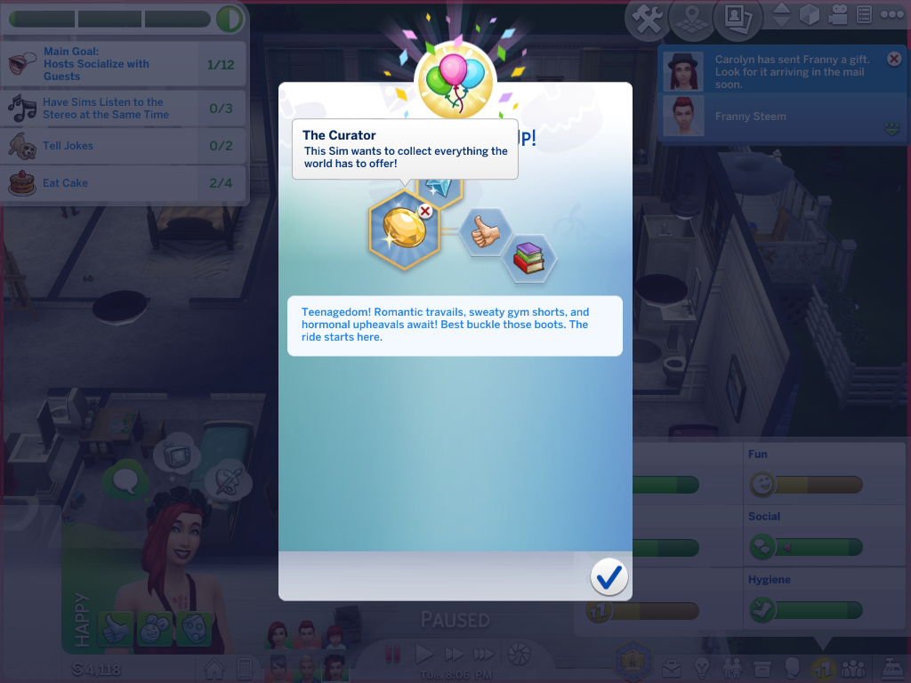 Franny aged from child to teenager and received the curator aspiration. The curator aspiration for Franny means, she will want to collect everything.