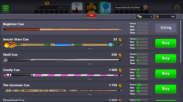 To improve the ability and also the finances we have, in the android game 8 Ball Pool also provides the purchase of club bat, coins, and others in the Shop menu located at the bottom of the game screen.One that we can buy in this 8 Ball Pool Shop or Shop is a bat or Cue stick. The sticks include: Soccer Stars Cue, Skull Cue, Pine Cue, Cowhide Cue, Candy Cue and so on up the premium stick.