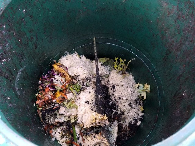 Here’s a picture of the plastic bin. There are lots of worms and bugs in it. When you take the lid off a swarm of insects come out. I turn it occasionally to let it mix and get more air. It usually doesn’t smell much. If your pile starts to stink turning it or adding more dry material will help.