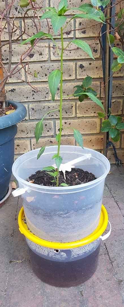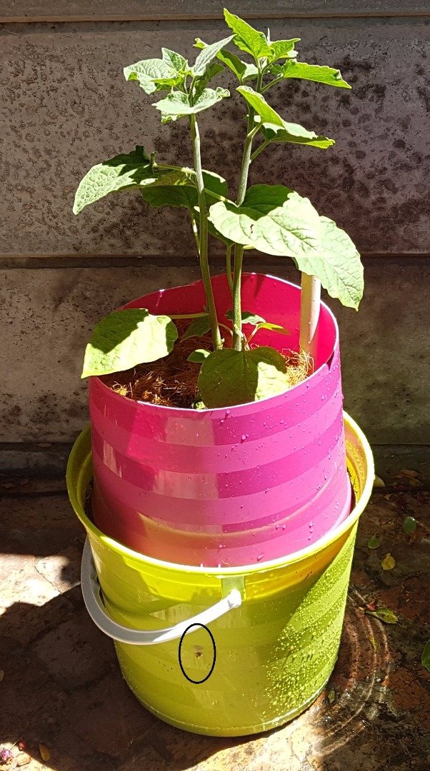To provide some stability I added some dry soil around the base of the plant. I filled the base container with water (through the white pipe) until the water dripped out the ‘overflow’ hole (circled in the pic below)