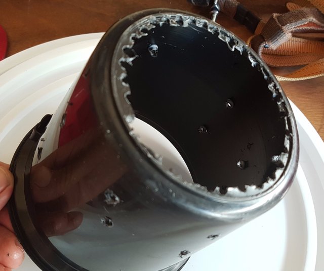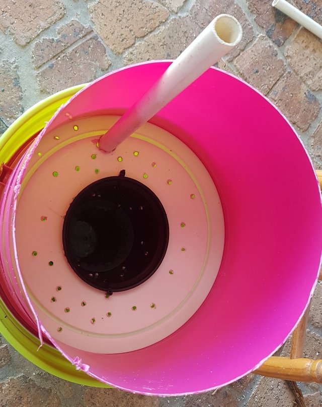 I cut another hole in the lid to thread a pipe through. This pipe will be used to feed water into the base. I lowered this lid and wicker into the bigger bucket until the taper of the bucket stopped the lid from going lower and the wicker basket was at the bottom of the bucket