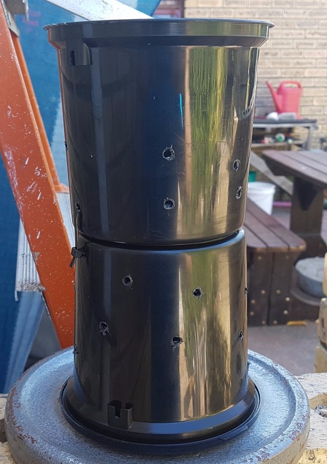 From the above picture, one can see that I then removed the bottom from the bucket and turned it upside down and placed it on the original lid… perfect fit. This will then become the ‘plant pot’