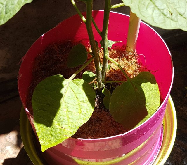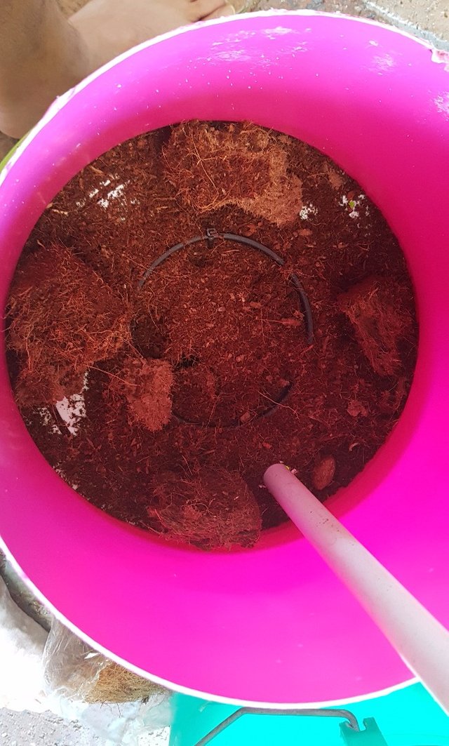 I then decided to avoid the use of conventional soil and see if enough nutrition can be provided through the water. I filled the wicker with coconut peat and the pot with coir.