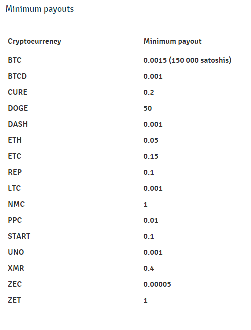 Here is the chart of how much of each crypto you need to accumulate before receiving a payout: