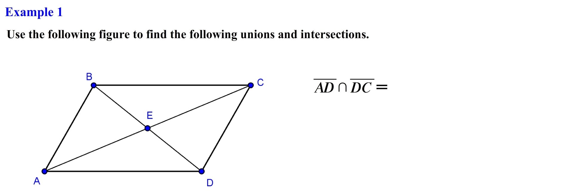 In this first problem they are asking us to find the intersection of line segment AD and DC. If we think of line segment AD as the set of all points that forms this line we would obtain the following points, in the same manner the set of all points that form line segment DC will consist of the following points. Since we are trying to find the intersection of these two set of points we see that both lines contain one point in common in this case point D. So the intersection of line segment AD and DC is the set containing only point D.