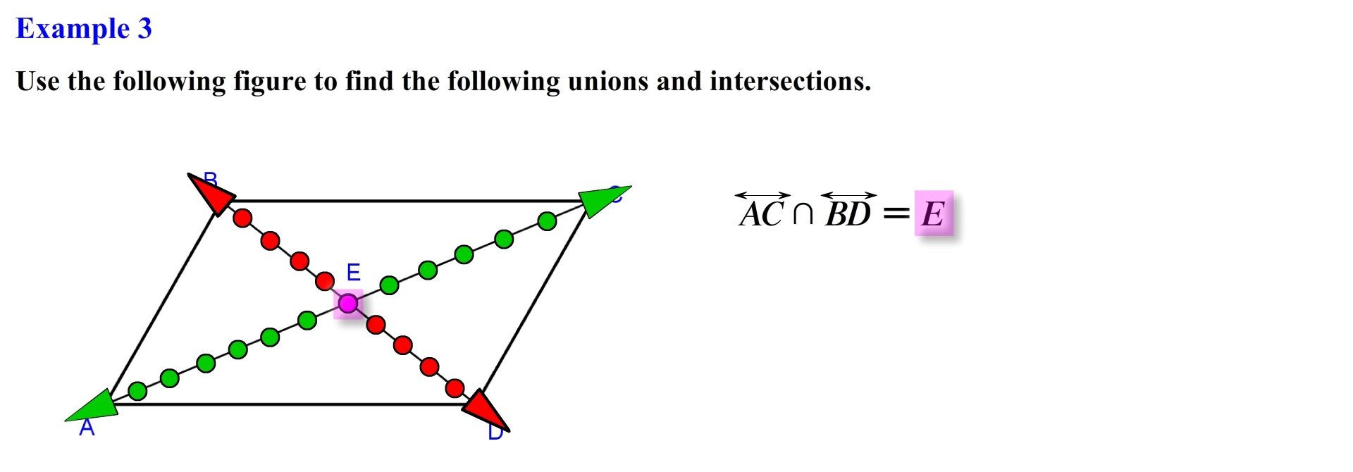 Here we are asked to find the intersection of line AC and line BD, the set of all points forming line AC are represented as follows and that of line BD are represented as follows, since we are looking for the intersection of these two lines we see that they have point E in common so the intersection of these two lines is the set that contains point E.