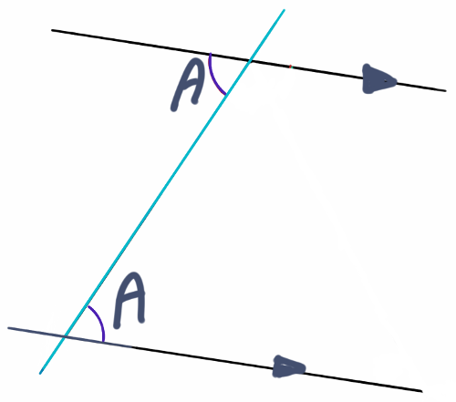 The alternate interior angles labeled A are congruent; they represent the same angle measure. This is true for all transversals cutting through a set of parallel lines. If you would like me to demonstrate this fact in a different post, please let me know.