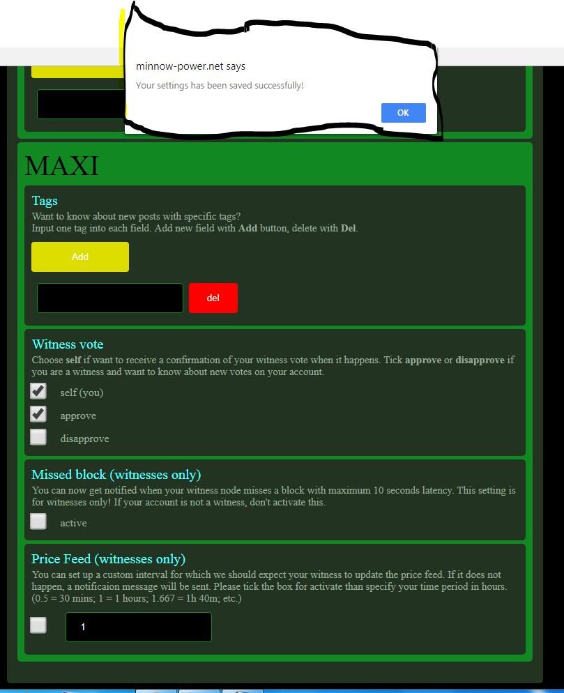 We can set here some option for notification such as Tags ,Witness vote,Missed block (witnesses only) and Price Feed (witnesses only) .