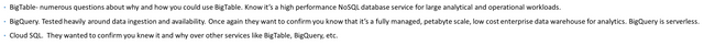 BigTable- numerous questions about why and how you could use BigTable. Know it’s a high performance NoSQL database service for large analytical and operational workloads.