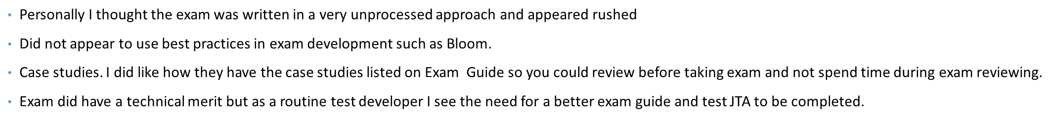 Case studies. I did like how they have the case studies listed on Exam Guide so you could review before taking exam and not spend time during exam reviewing.