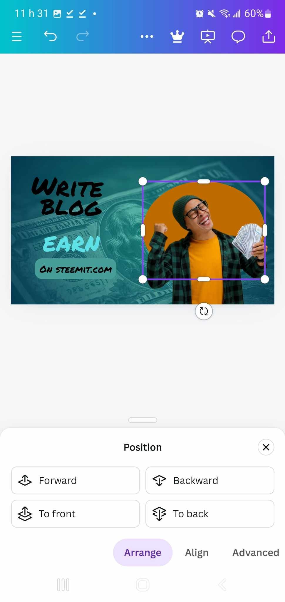 I applied the principle of emphasizing a keyword, such as "Earn", by changing its color to make it stand out. This helps guide the viewer's eye to the important elements of the message. I also added a second text, "STEEMIT.COM", which I strategically placed in the composition to complete the whole.