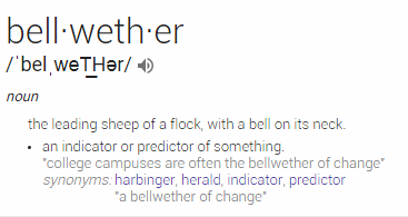 The idea of a bellwether in a flock is the leader. The shepherd places a bell around their neck to track the location of the flock, since all of the flock follows the bellwether.