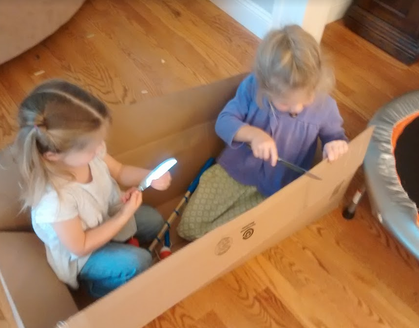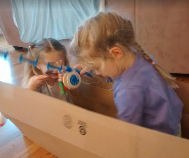 She got the idea to use a box as a boat and catch walleyes and salmons with their fishing poles. Her sister is right there with her.