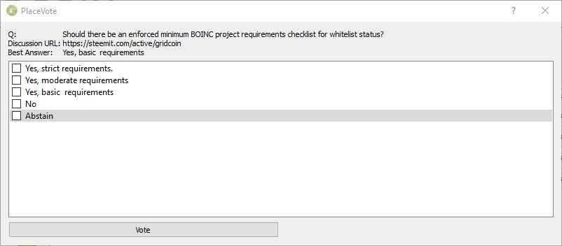 Finally, (for now) the “Voting” tab lies at the bottom of the list. This is a unique feature to Gridcoin wallets and allows the community to have their say regarding polls that have been put into place. The title of the poll indicates the question that is being asked. Usually there have been discussions around the issues being polled on the community forums such as CryptoCurrencyTalk, Slack, Discord, Telegram, Steemit and Mumble before the poll goes live.