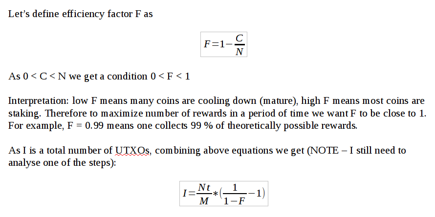 If we look at this iteratively, we start with N = nI coins. In the beginning, S = N = nI. Suppose n of those coins stake, meaning one UTXO stakes. Then S = N - n = nI - n = n(I - 1). If another n coins stake, then S = N - 2n = nI - 2n = n(I - 2). So if j is the number of staked blocks in the last 16 hours, then S = n(I - j). If I = j, i.e. if the number of staked blocks = number of UTXOs, this implies that all of the coins have staked and S = 0.