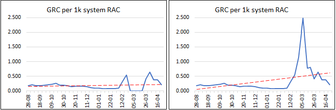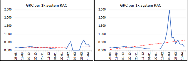 - GRC per 1k system RAC = The amount of GRC you will receive for a system per 1000 RAC points. Example: You have a system which is running Rosetta@home with a RAC value of 3500. According to the chart on 30-Oct, you should gain 3.5 x 0.42 GRC = 1.47 GRC per day for this system.