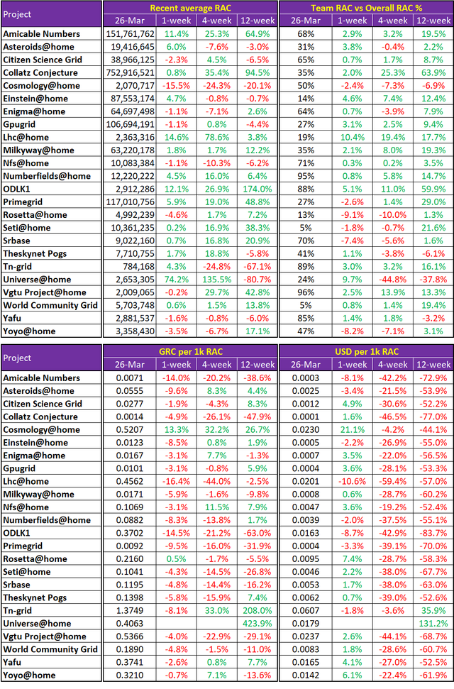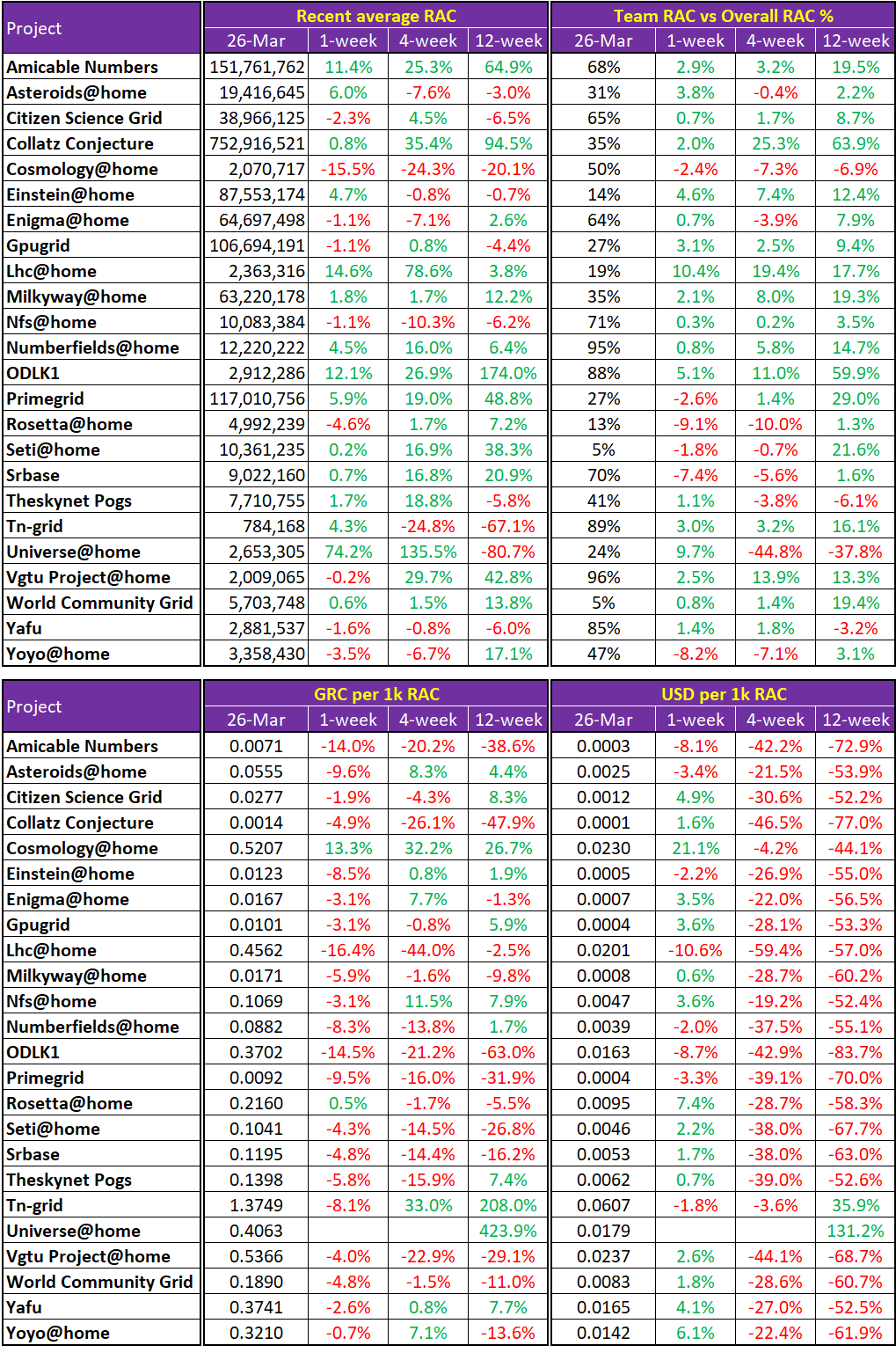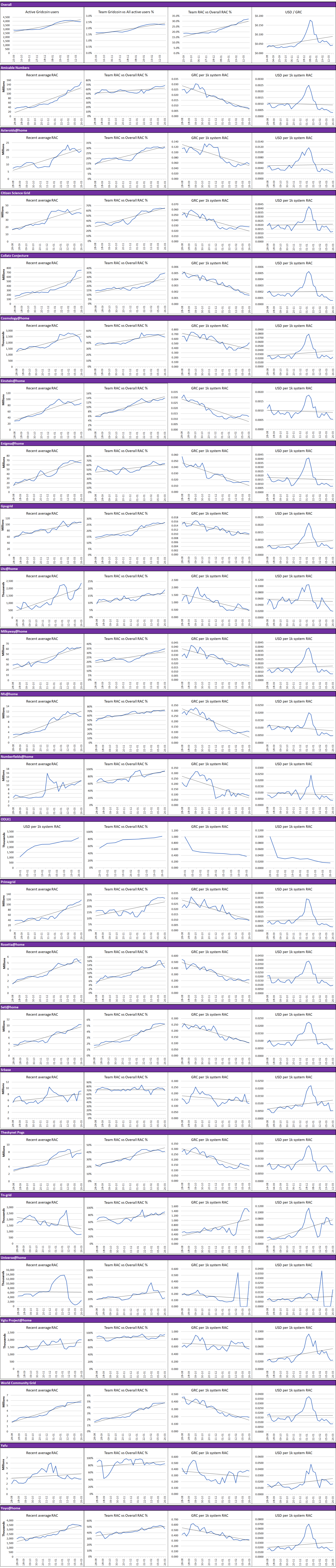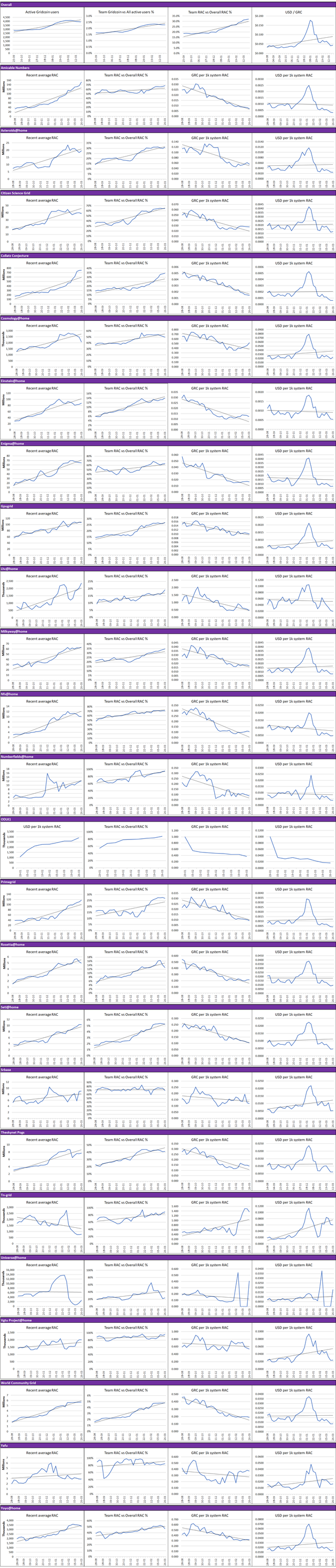 - Team RAC vs Overall RAC % = The proportion of RAC output team Gridcoin has produced as part of the overall RAC for the project.