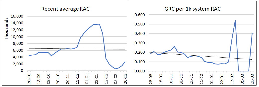 In the chart above on the right, you can see the GRC per 1k system RAC increasing dramatically until it was greylisted with payments ceased during a period of 4 weeks. Last week, after whitelisting, payments started again with an elevated earnings level but this will decline if there remains sufficient work.