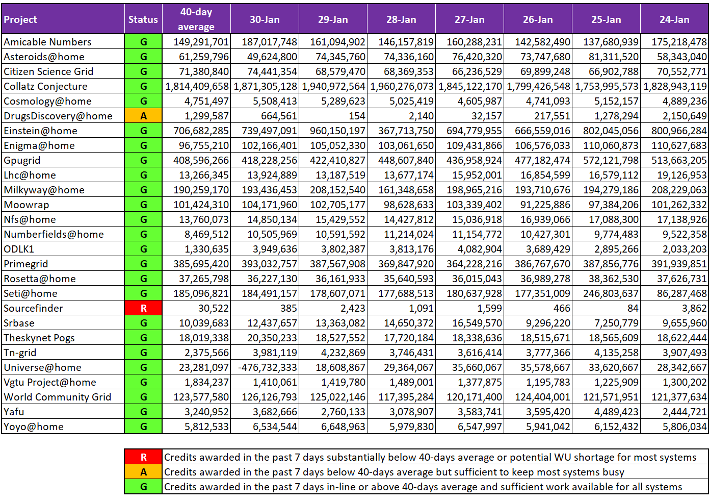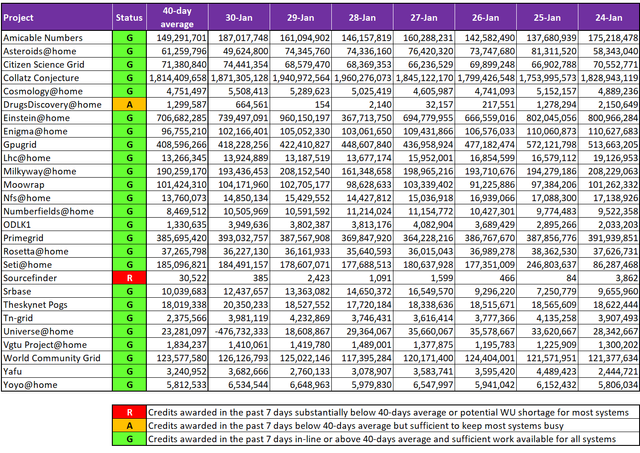 Finally @aharders has just added a comment below about Universe@home which has stopped producing WUs due to BOINC software issues. I did notice a big negative number on 30-January but I’m not sure whether this is related or just an error/correction in the stats generation. I have left the status on (G)reen based on the credit allocation in the last 7 days but let’s monitor the development until the next update.