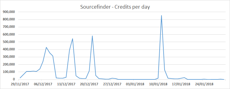 The situation is still very different for Sourcefinder with another week of very limited WUs. Checking the latest updates on the forum [here], it seems that the new work-units are not running well with no further updates how this will be resolved. I have added a chart below to show the awarded credit developments in the last 3 months.