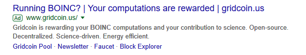 Advertisements displayed on Google are text-only, so they look a bit dull according to today's standards. But Google offers various ways of enhancing them through so called extensions, making them more relevant and noticeable. Four Gridcoin sitelink extensions have been created so far: Gridcoin Pool, Newsletter, Faucet and Block Explorer: