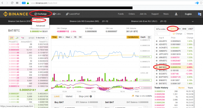 Now you can trade any Bitcoin/Altcoin pair offered by Binance. You select the Exchange > Basic menu, and in the new page you search for the desired currency in the BTC column. For this example, I chose the BAT/BTC pair.