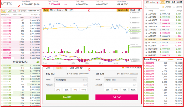In section F, the last completed orders are displayed. In the picture the last order was at 16:33:28, 153 BAT coins were sold for the price of 0.00005273 BTC per BAT coin. The value appears in red because the average price has fallen after this exchange - green appears when the price increases..