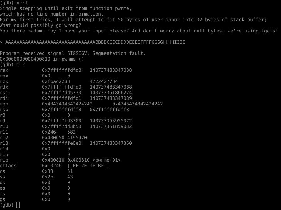 functions, and spaff some junk into it to confirm that we do have control over registers from the stack buffer overflow.
