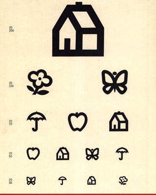 The doctor asked him to stand at up and identify the objects from the eye chart, alternately covering the eyes. The images were the same, just of different sizes.