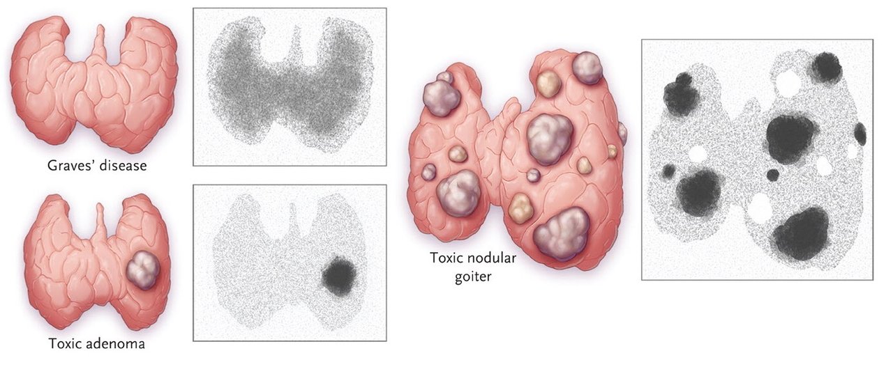 Toxic adenoma: there is a single hyperfunctioning thyroid nodule. It represents approximately 3-5% of cases.