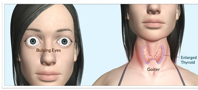- Ophthalmopathy: present in Graves-Basedow disease. There may be inflammation, tearing, shrinking of the eyelids, swelling around the eyes, bulging eyes (exophthalmos).