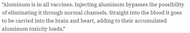 Now it is true that very small amounts of aluminum (<1 mg) are present in many vaccines as various aluminum salts to help improve the immune response, however, the average adult ingests around 7-9 mg of aluminum each day through their diet. While most of this ingested aluminum never the bloodstream(only <1% does), it certainly contributes more to the total amount present in the body than vaccines over time. Secondly the majority of aluminum that enters the bloodstream is eliminated by the kidney, generally 1/2 in <24 hours and >3/4 over the next few weeks.