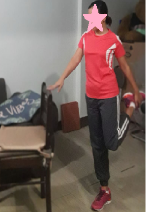 While standing, place one foot on a chair, with the toes of that foot pointing up toward the ceiling. Keep both leg straight, with your knees locked but not hyperextended. With your hands on your hips gradually bend forward until you feel a gentle tension in the back of the thigh (the hamstring) of the elevated leg. Hold the stretch for five seconds, then relax it for five seconds, hold it again for five seconds, then relax for five seconds. Repeat this procedure on the opposite side. Be sure to breathe deeply but naturally during the entire stretch.