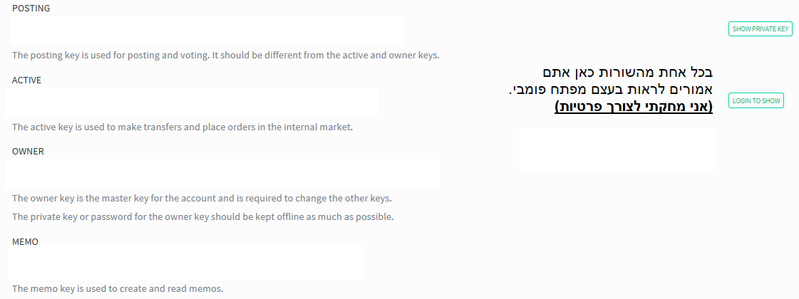 Memo key- אם למישהו יש את הpriavte memo key שלכם הוא יכול לצפות בהודעות הפרטיות שלכם.