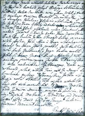 do not be too sorrowful and affraid on account of this letter. Gods will be done. Tomorrow at ten o'clock they will cut off my head and your brother's too. Today we excused each other with all our heart. Therefore I ponder this letter and ask you for everlasting forgiveness. If I have mistreated you in some way, or offended you, as well I know, forgive me. In the name of our Father I am quite prepared to die and am not afraid. I hope that the Almighty God who has humiliated me in this world will have mercy on me. I would pray to him and ask him to whom tomorrow I hope to come that we may meet each other in everlasting glory before the Lord. I know nothing else to write to you about, neither our son nor the rest of our poor possessions. I have left this to God's will. Do not be sorry, everything had to be so. In Wiener Neustadt, the day before the last day of my life, at seven o'clock in the evening, April 29th, 1671. May Almighty God bless you together with our daughter Aurora Veronika.