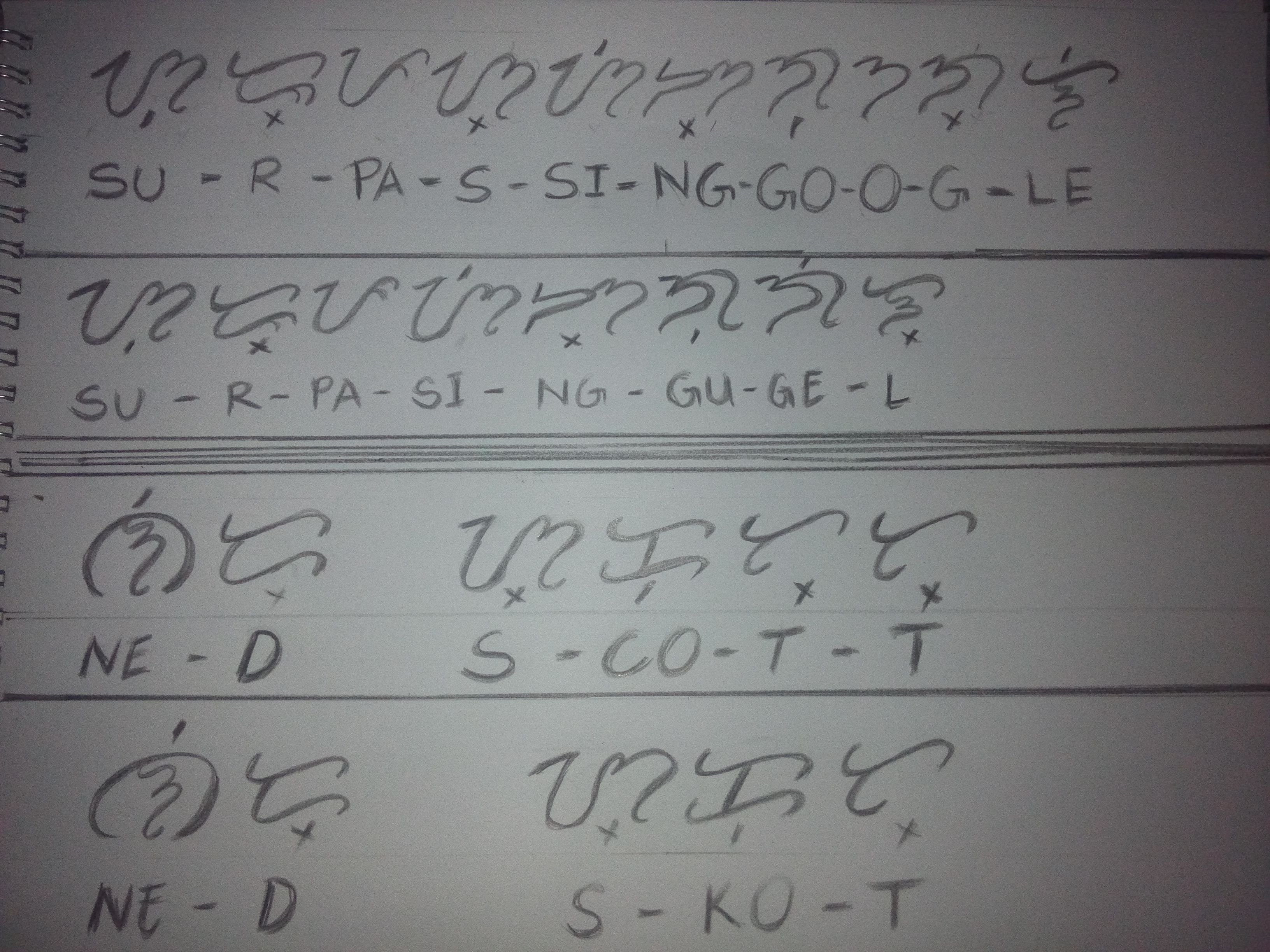 You can use Kudlit If you want to write something that doesn't rhyme with "a" ) this would require learning a whole other set of letters for each vowel sound. We use the same consonant letters shown in the list above and simply combine them with a special mark, called a kudlit, to change the sound of the vowel "a".