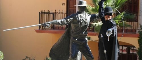 Statue of Zorro with plaque stating that it is the Birthplace of Diego de la Vega