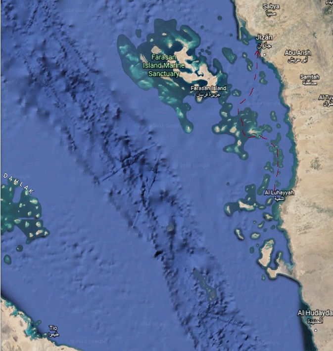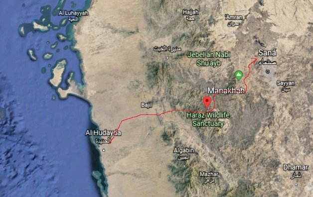 Map of the approximate path the sailors took from Hodaidah to Saná(in red), drawn by myself using google earth and historical texts.