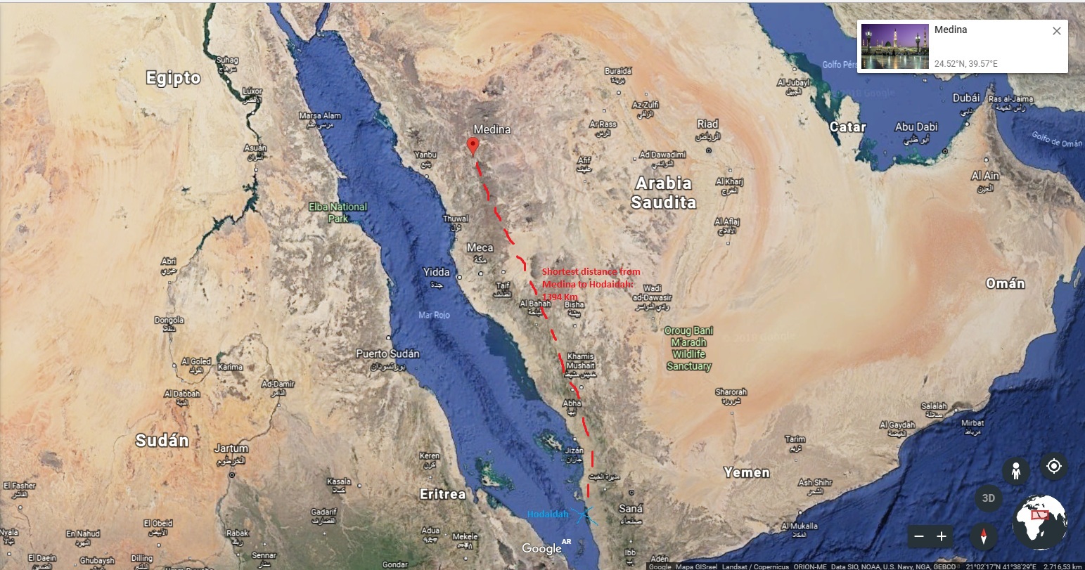 Map from Google Earth, edited by myself. In blue, the location of the old city of Hodaidah(Al Hudayda). In red, the shortest distance to Medina(1394 km, according to google)