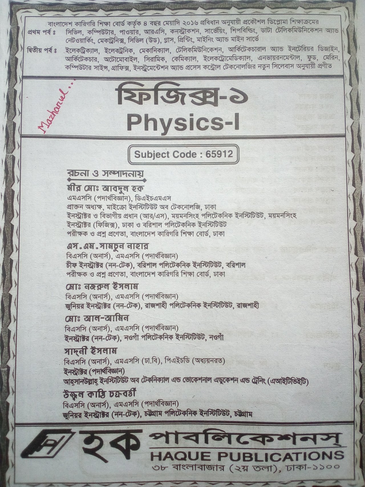 - The book has a total of 11 chapters and practical parts. Various aspects of physics are discussed here. This book is by Haq Publications. The books in this publication are good.