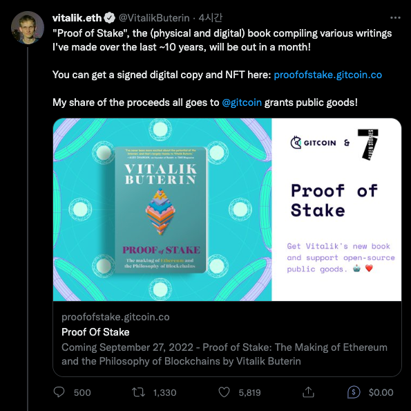 안녕하세요, 디온입니다. 오늘 비탈릭 부테린이 자신의 트위터를 통해 지난 10년여 동안 자신이 쓴 글들을 모은 Proof of Stake라는 책이 출간될 예정이라고 소개를 하면서 많은 관심을 받고 있습니다.